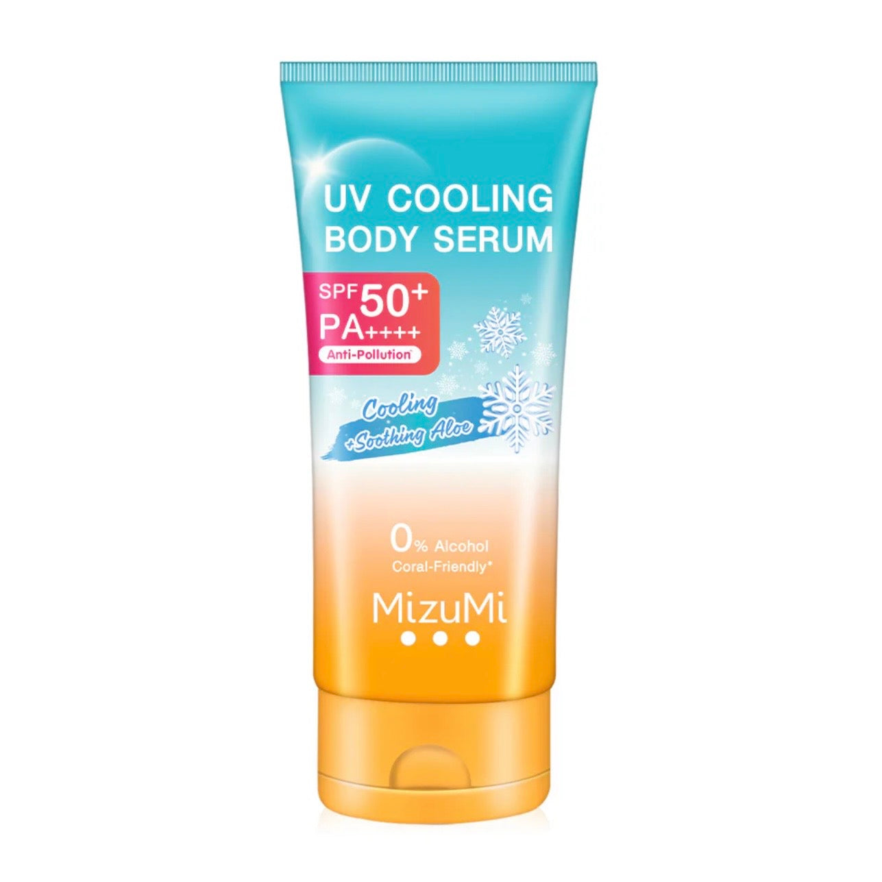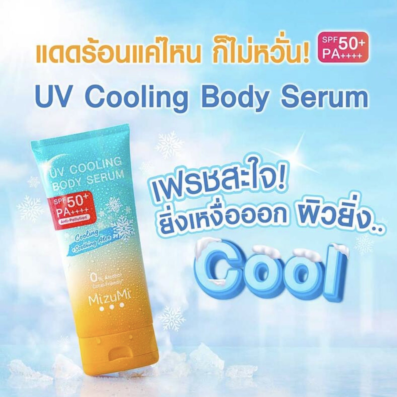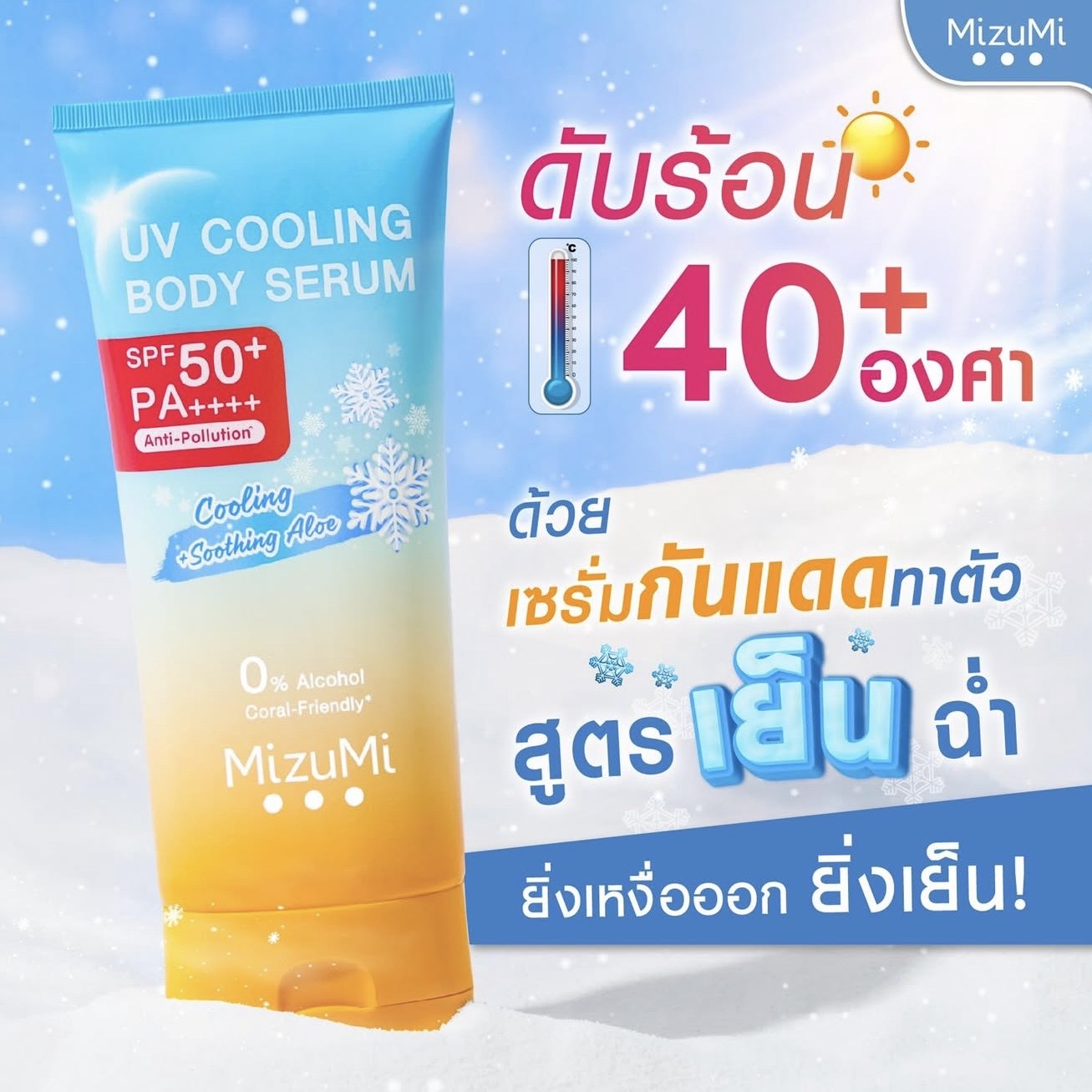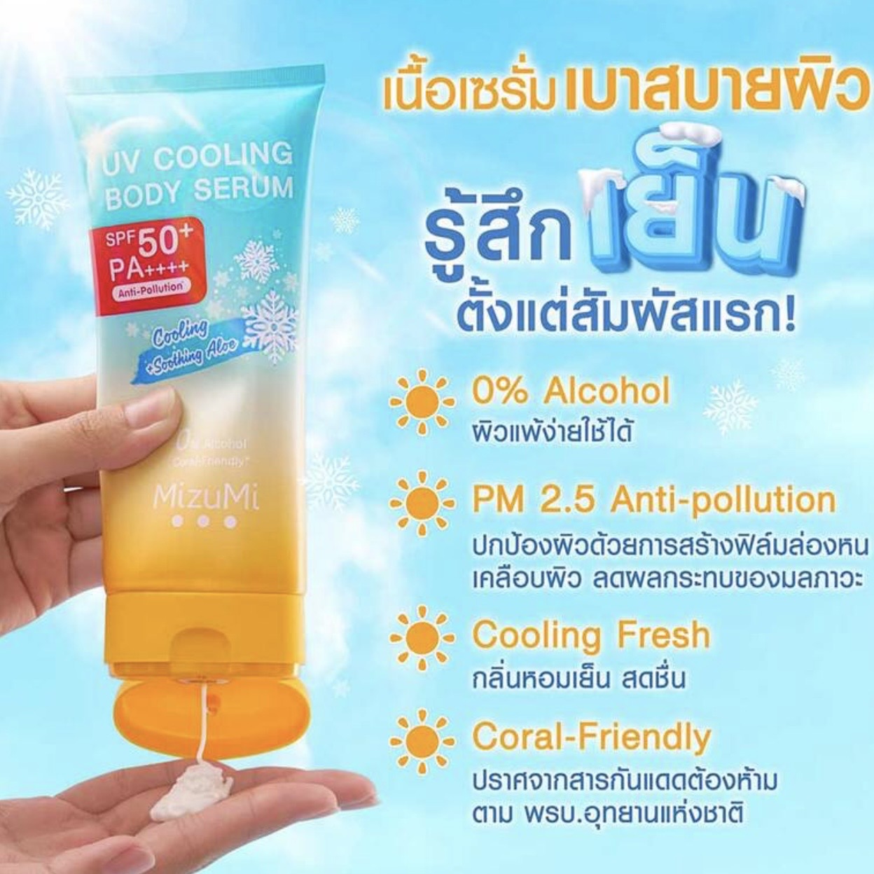 เซรั่มกันแดดผิวกายสูตรเย็นจากมิซึมิ เนื้อบางเบา ซึมไว เพิ่มความชุ่มชื้นและช่วยปลอบประโลมผิว พร้อมสัมผัสเย็นสบายทันทีหลังทา ปกป้องผิวจากแสงแดดและมลภาวะด้วย SPF50+ PA++++ สูตรอ่อนโยน ปราศจากแอลกอฮอล์ พาราเบน ซิลิโคน มิเนอรัลออยล์ และ DMDM